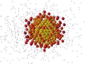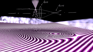 Fig. 1: Two intense attosecond pulse trains (white) interact with an atom, resulting in the emission of three electrons (yellow). During this process four photons (blue) are absorbed. The probability of this process can be controlled by varying the temporal and the spatial overlap between the two attosecond pulses. Image credit: Balázs Major